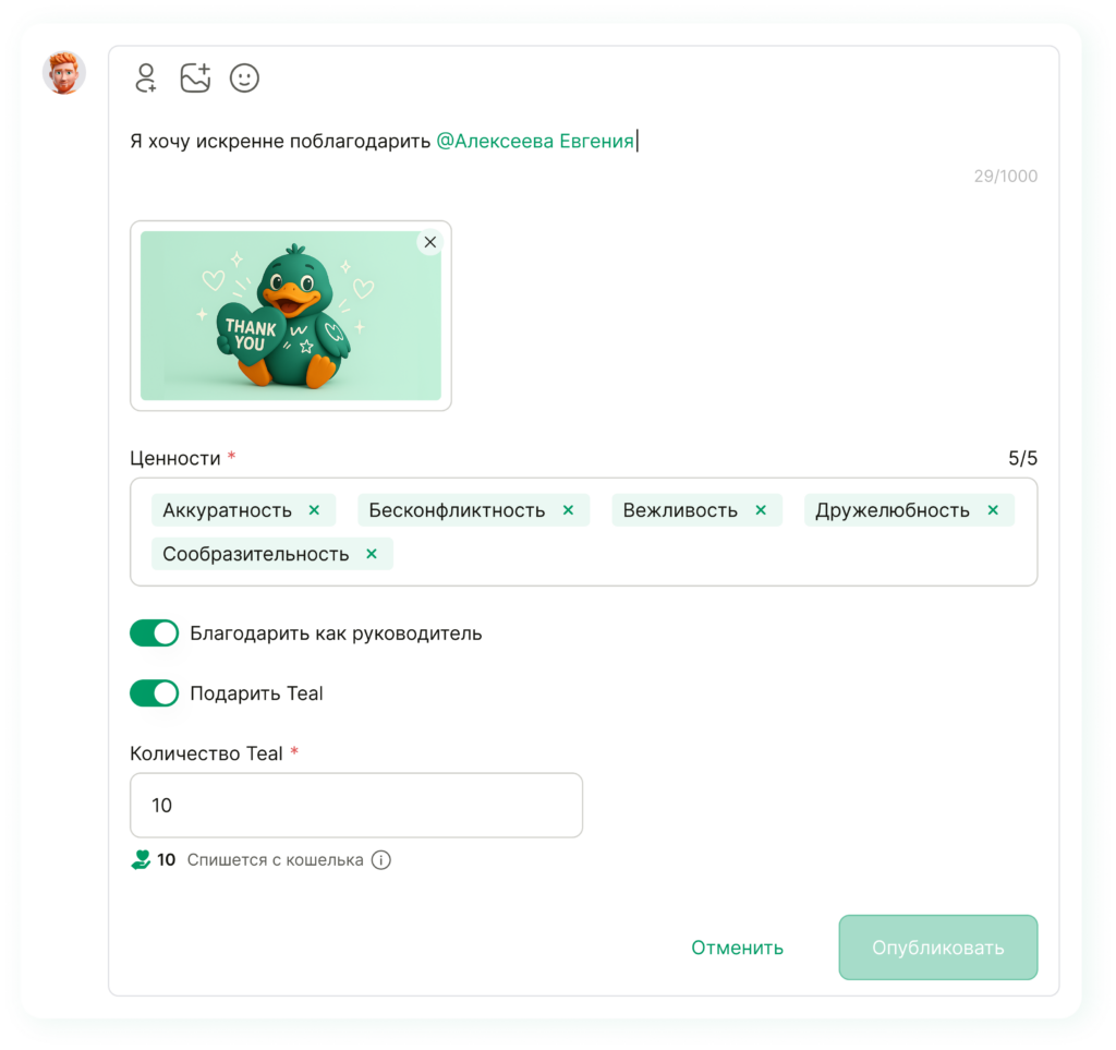 После выбора автоматически включится режим благодарности от руководителя. Его можно выключить, если руководитель захочет перевести валюту с кошелька благодарностей и поблагодарить сотрудника как коллегу. Дальше остаётся заполнить несколько вещей: