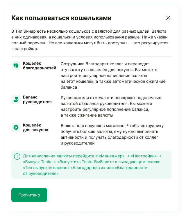 - Увидеть подсказку при создании первой благодарности от руководителя с передачей валюты