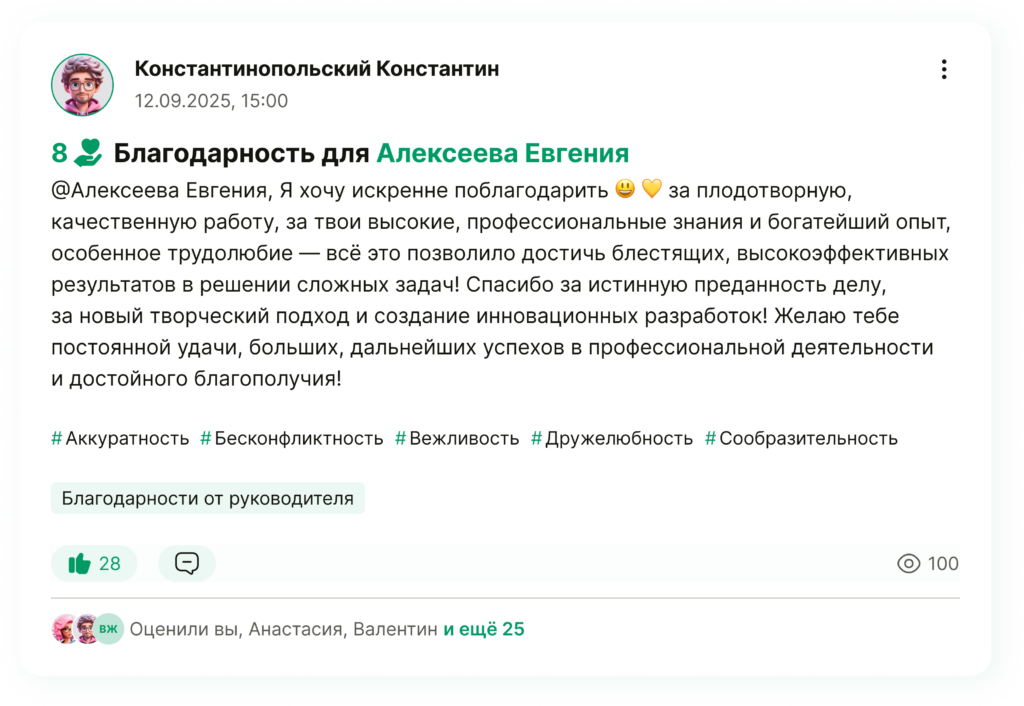 Пример благодарности: команда внедряла новый модуль для клиентов. Один из сотрудников взял на себя координацию между отделами и довёл задачу до результата. Руководитель публикует благодарность: