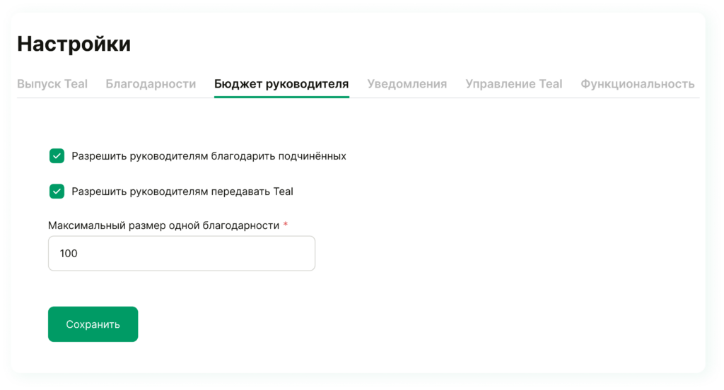 Перед тем, как руководители смогут отправлять благодарности, нужно включить функцию. Для этого перейдите в раздел Настройки → Бюджет руководителя → и выберите «Включить» или «Выключить». Там же можно настроить возможность перевода монет и настроить лимит одной благодарности. Отметим, что лимиты для благодарностей от руководителя не связаны с лимитами в пункте «Благодарности» — он касается только благодарностей между коллегами.