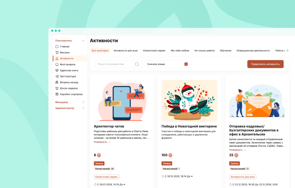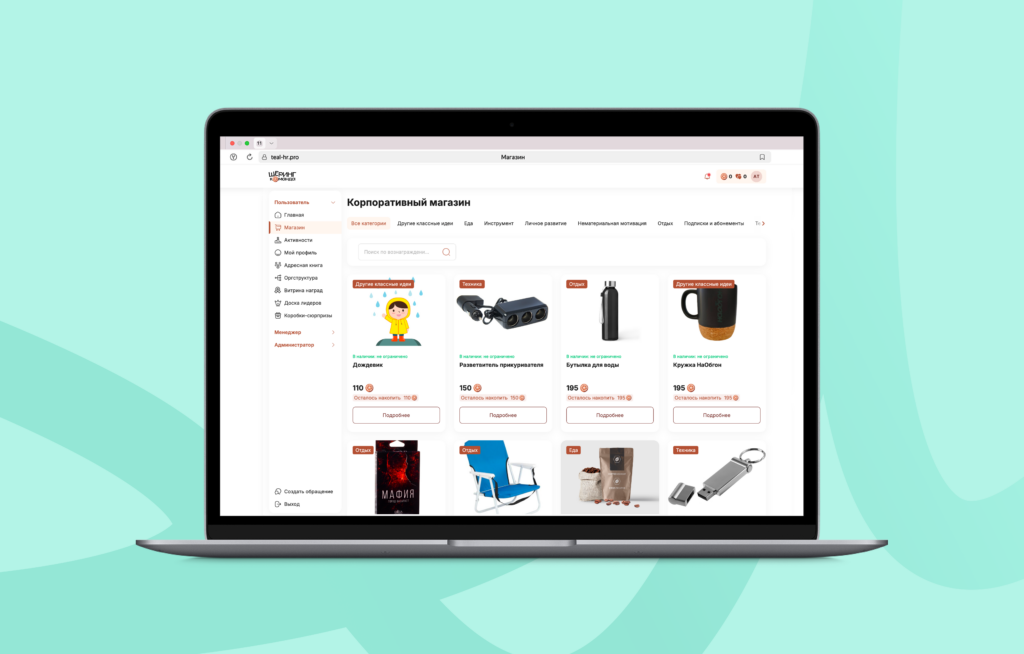 «Пряник» — это выбор команды «Наобгон». Вы можете назвать валюту как угодно, оформить платформу под свой бренд и выбрать те механики, которые подходят вашей корпоративной культуре и соответствуют целям компании.